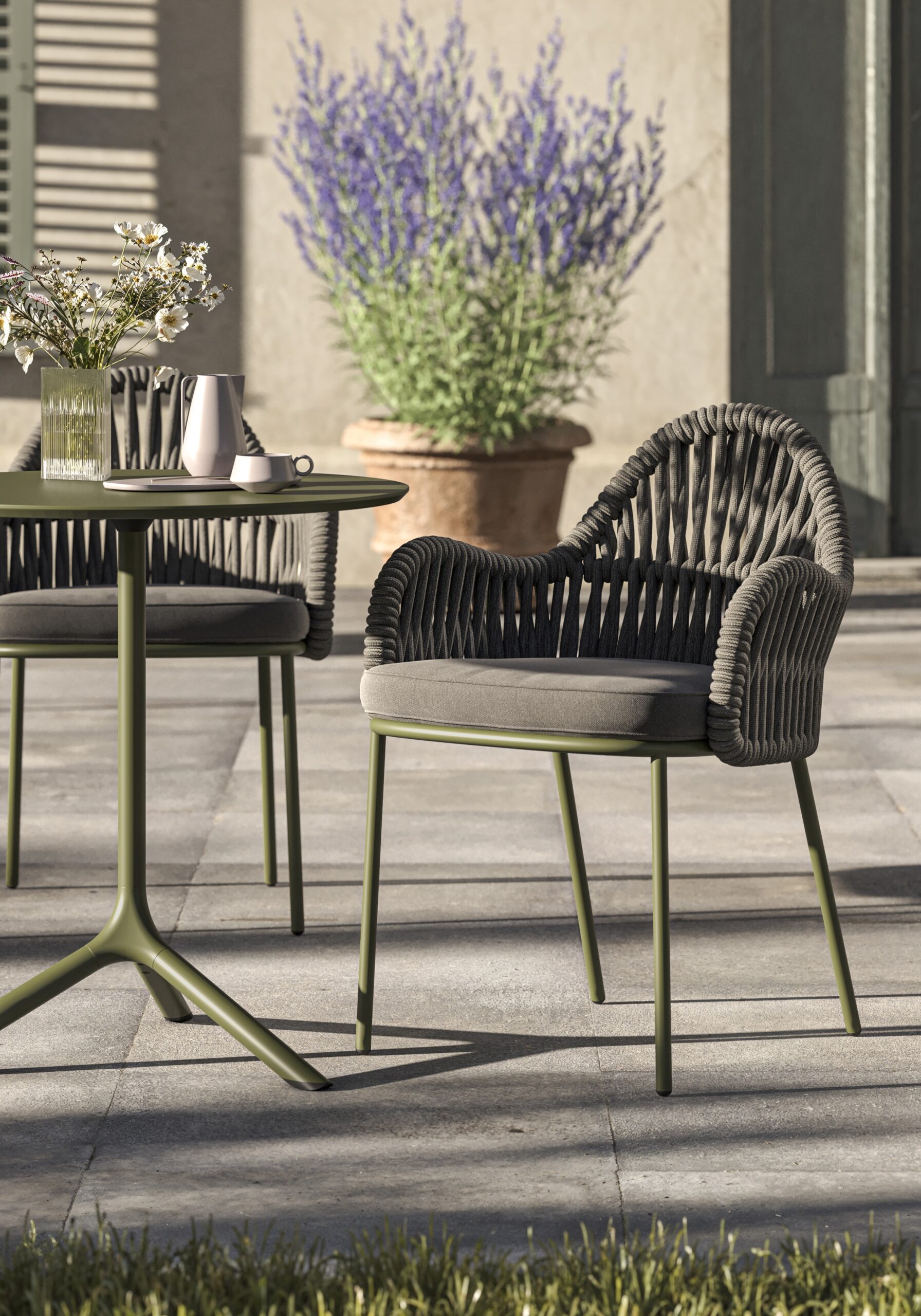Malvasia Riviera, evoluzione della sedia Malvasia, presenta uno schienale in corda intrecciata che le conferisce un aspetto caldo e naturale. L’intreccio evoca le morbide texture di un tessuto, avvolgendo con garbo la struttura in tubolare curvato. Il telaio è impreziosito da braccioli dalle proporzioni generose e da una seduta imbottita che garantiscono un comfort immediato. L’uso di corde melangiate tono su tono offre