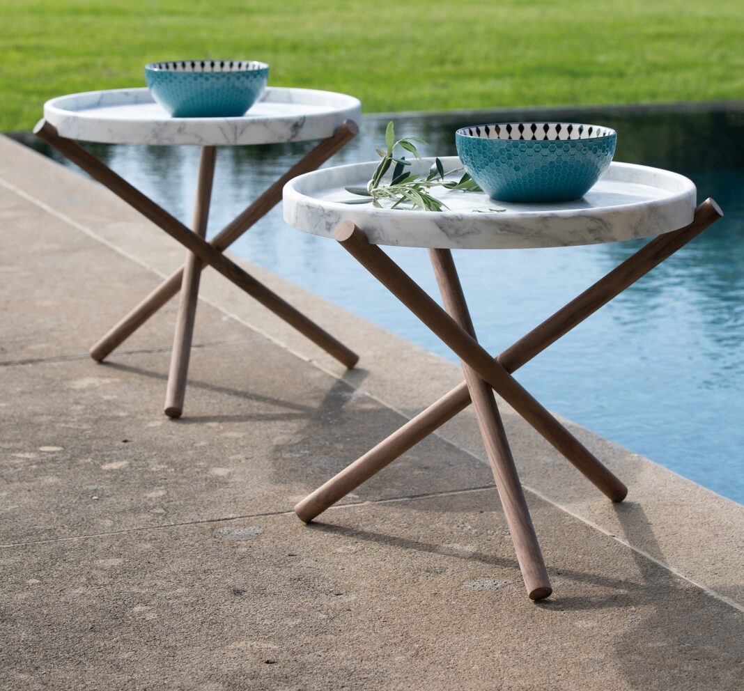Lase è un tavolo di servizio composto da una base in legno, su cui si appoggia un vassoio amovibile in marmo bianco di Carrara. Grazie alla lavorazione su centro di lavoro CNC, ogni pezzo è ottenuto da un blocco unico di pietra, con bordi smussati e superfici levigate, trattate con prodotti antimacchia. Di Veltha.