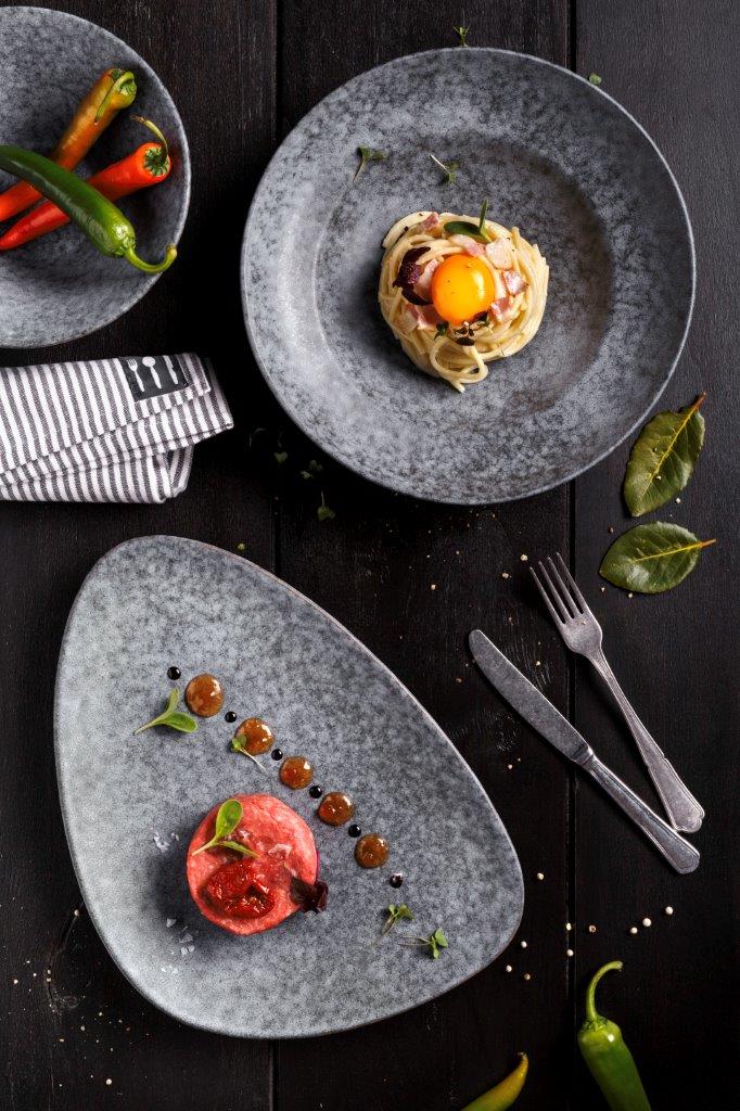 Il servizio in stoneware Organica Terra è composto da piatti, insalatiere e coppette dalle linee moderne e dal gusto minimal. La texture grigio fumo, in stile granito, esalta i colori accesi dei piatti della tradizione italiana.