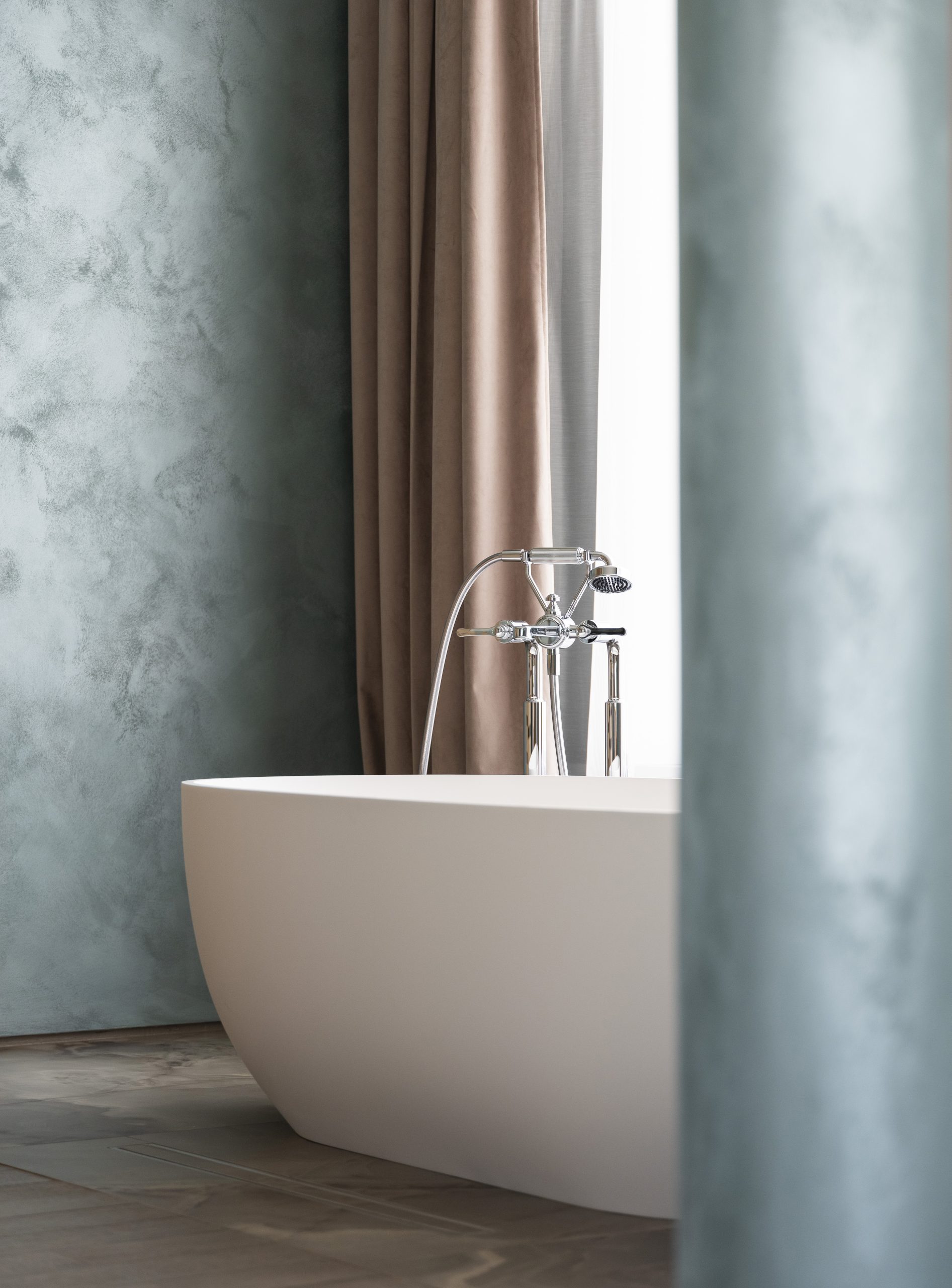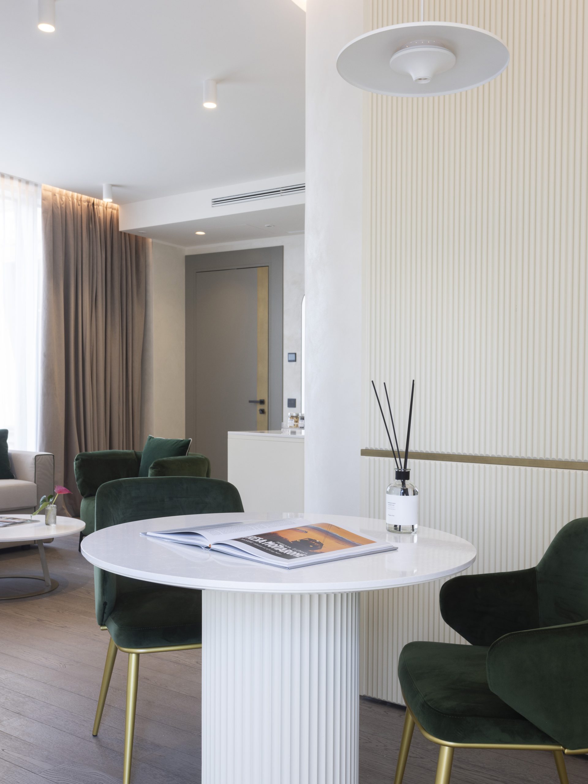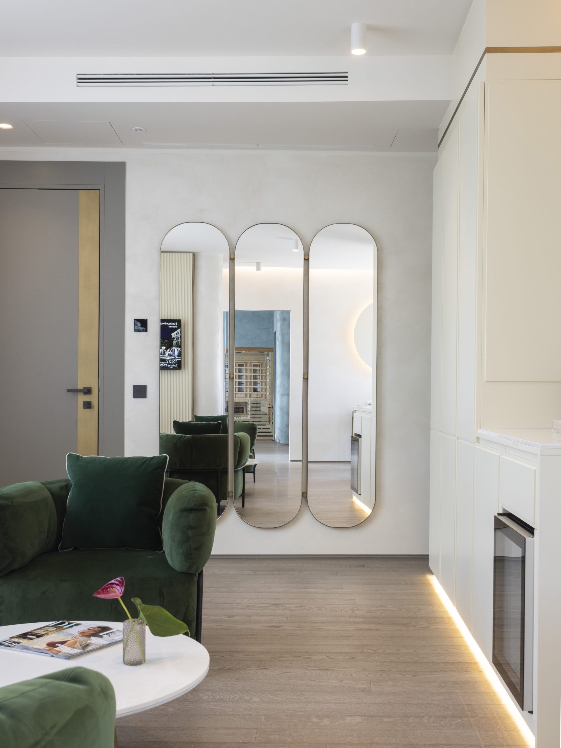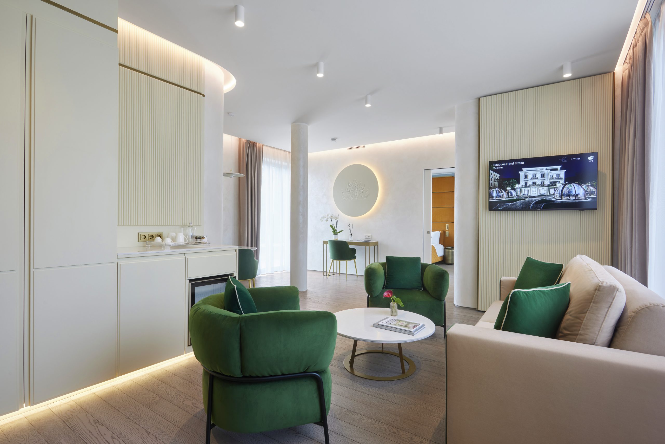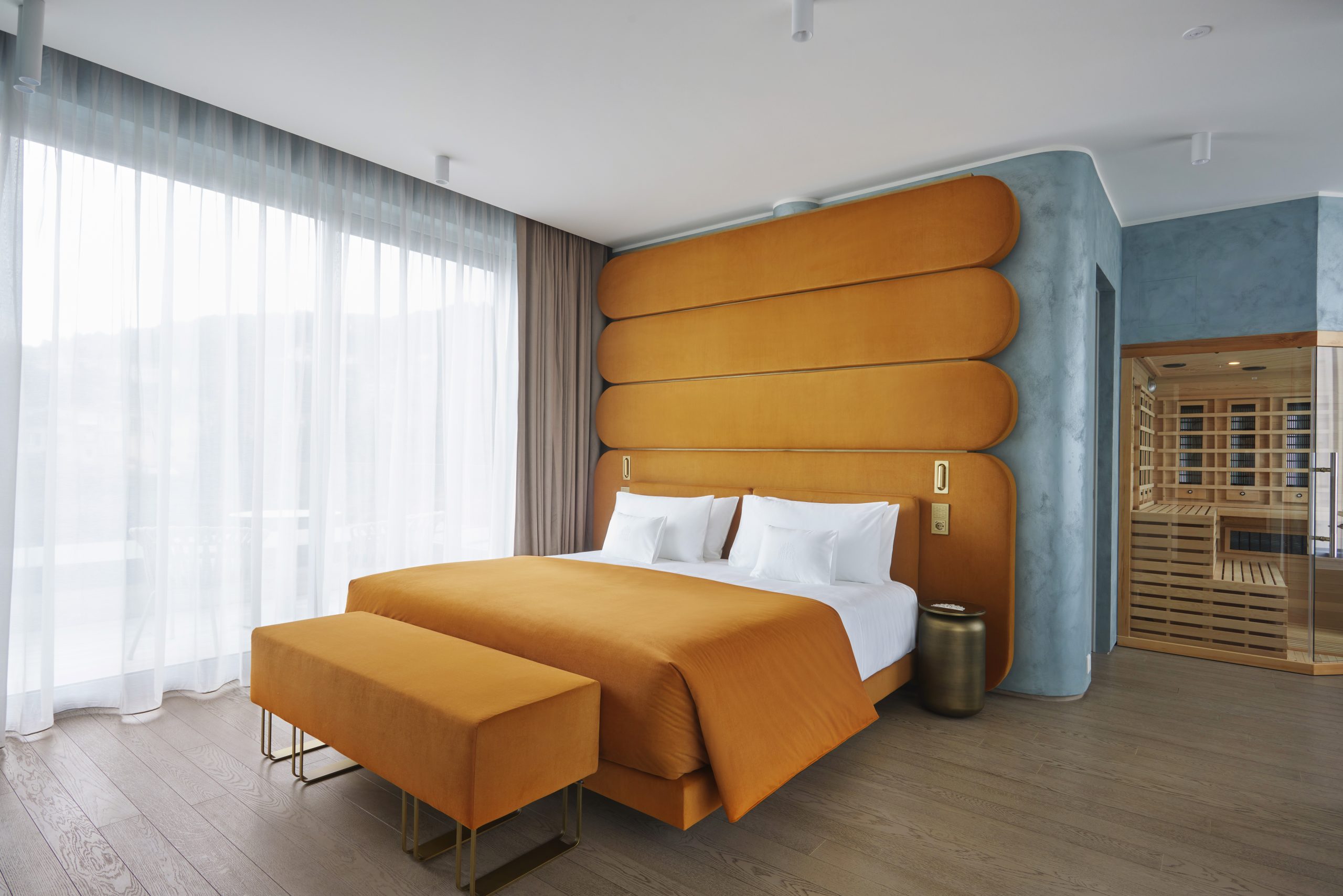 Il soggiorno, luminoso e caldo, richiama la luce del mattino. Il verde velluto ricorda le montagne e i parchi che circondano l’hotel. La camera da letto si accende di blu e arancioni intensi, come il lago al tramonto. Al terzo piano dell’edificio, la suite gode di una doppia esposizione.