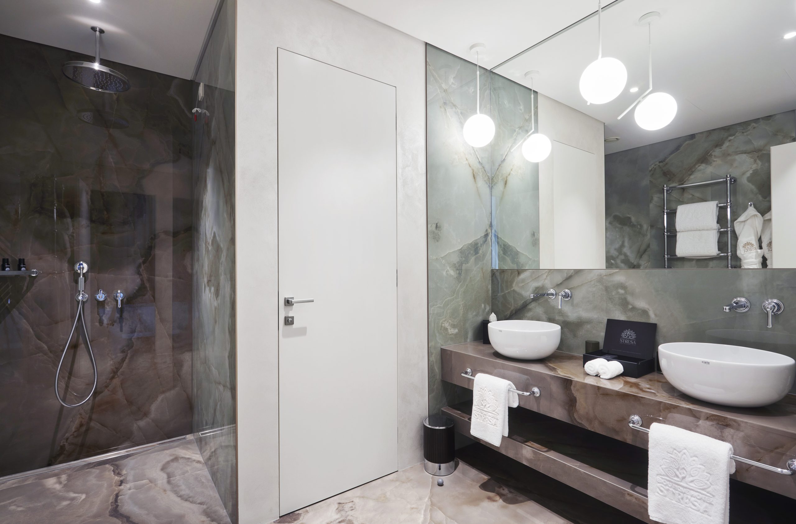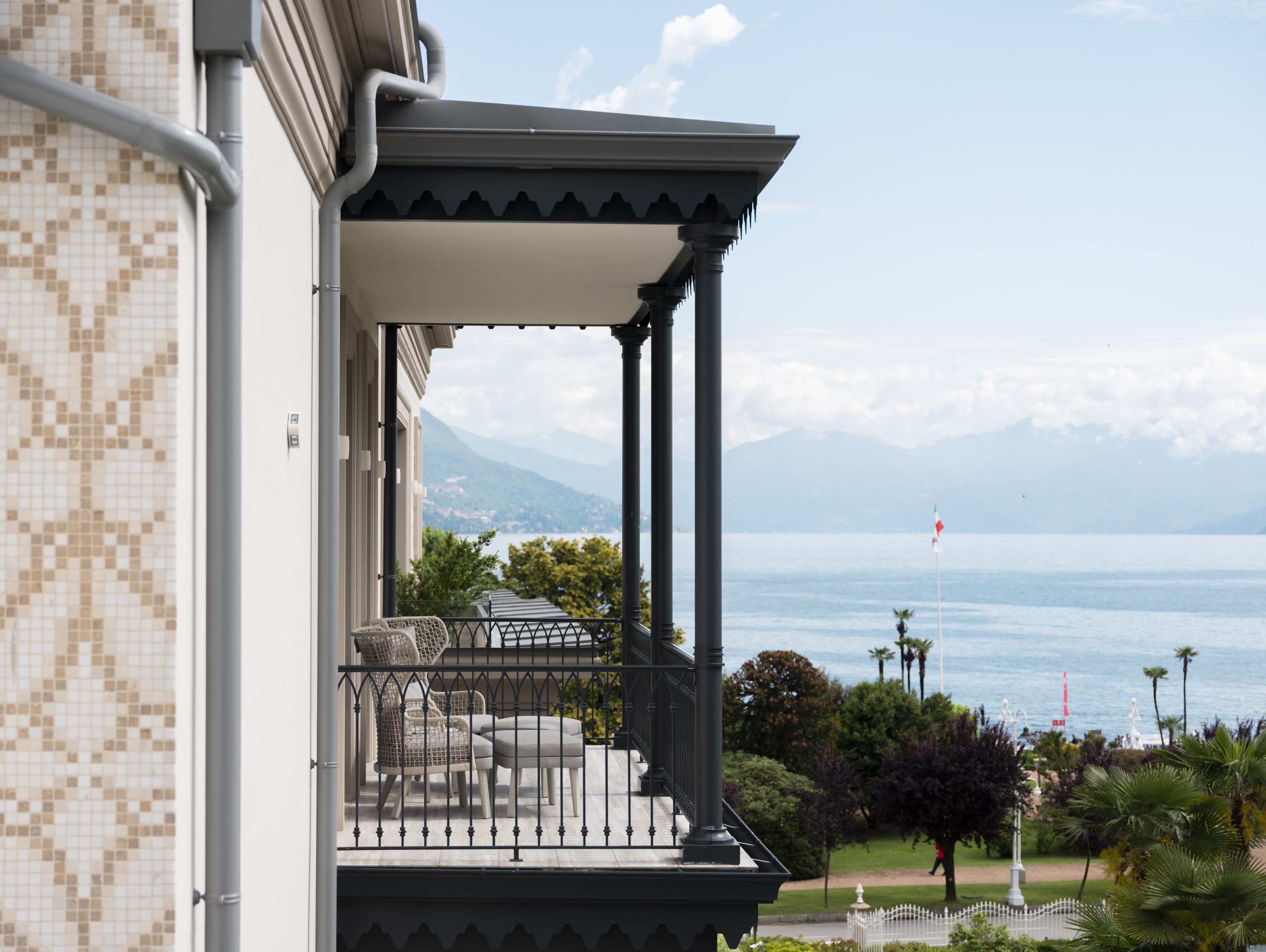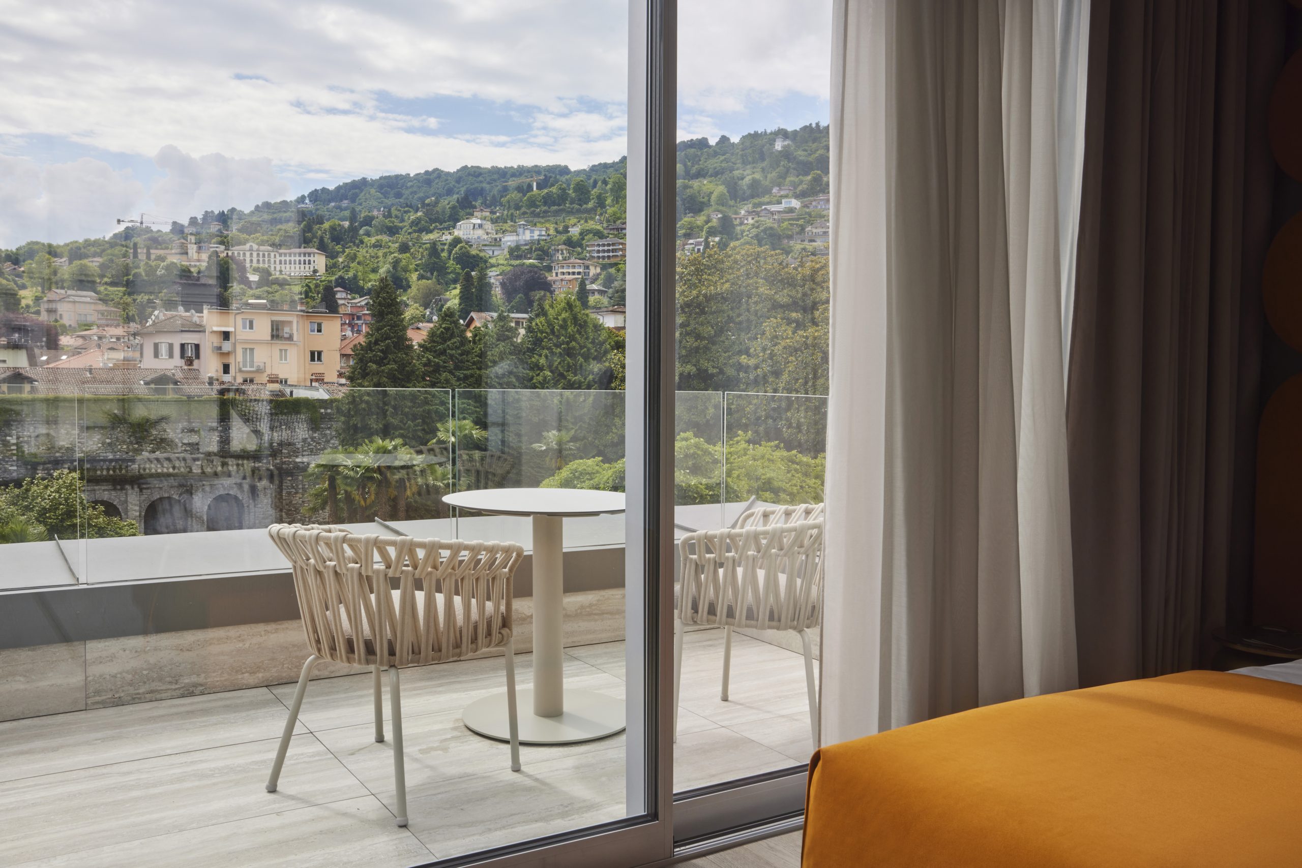 Da un lato, una terrazza arredata regala lo scenario perfetto per colazioni silenziose, con vista sul parco privato della Villa Ducale e il canto degli uccelli in sottofondo. Dall’altro, un balcone con poltrone Varaschin affacciato sull’Isola Bella: l’occasione per fermarsi, leggere, guardare. Il letto king size, con testiera arancione che si estende fino al soppalco, è vestito con biancheria Rivolta Carmignani. Una celebre attrice britannica lo ha descritto così: “È come dormire in cielo, coccolati dalle nuvole”.