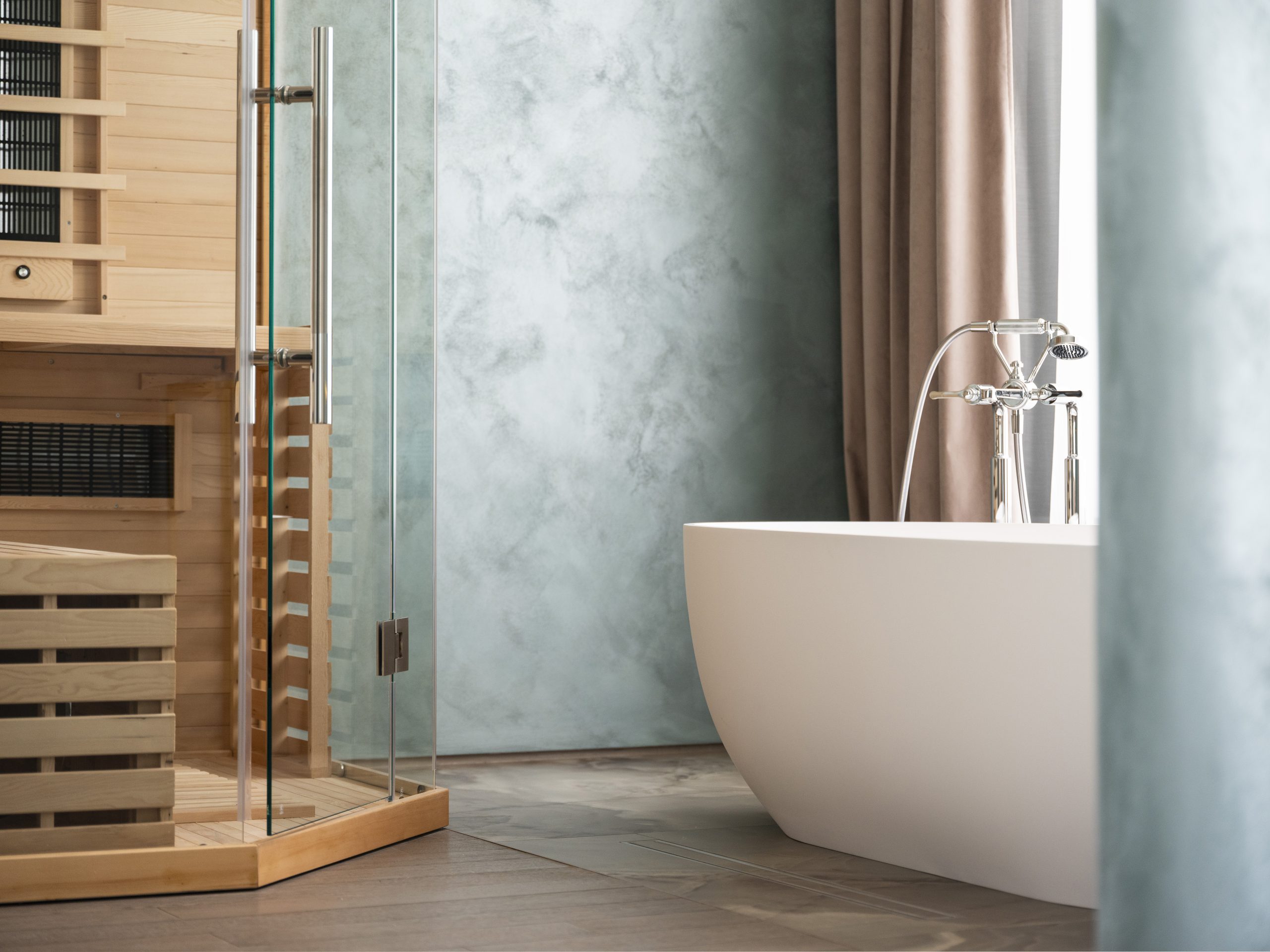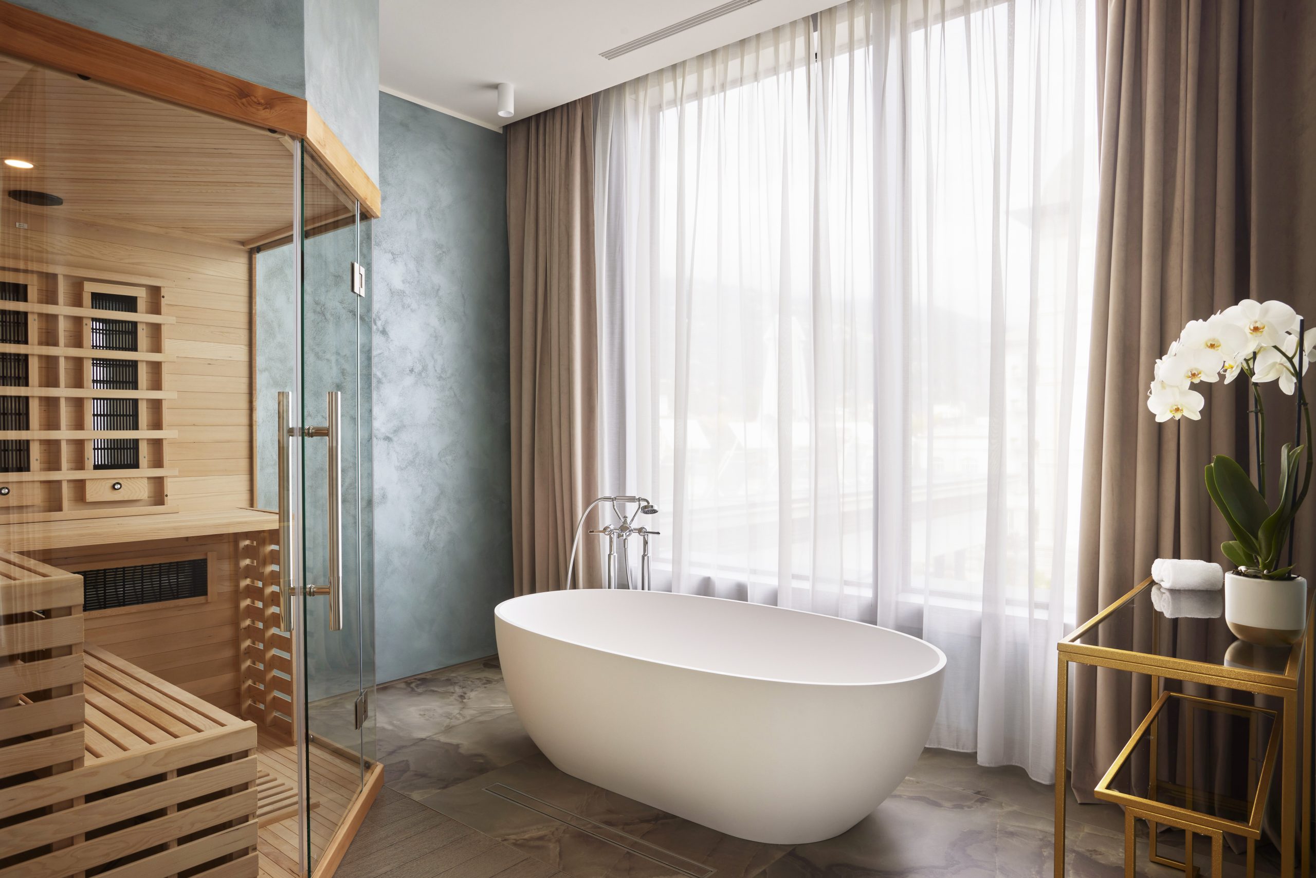 L’area benessere privata si apre in un layout arioso, con vasca freestanding in Corian e sauna a infrarossi in legno naturale. La doccia walk-in, i doppi lavandini e gli accessori selezionati completano uno spazio pensato per rigenerare. In linea con la filosofia sostenibile dell’hotel, il kit bagno include l’essenziale: tutto il resto è disponibile su richiesta, per evitare sprechi.