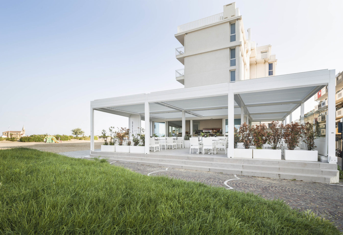 I miglioramenti e le scelte sono state fatte in funzione di stile, tecnologia, comfort e sostenibilità per garantire le migliori condizioni di protezione dal sole e dagli agenti atmosferici, regalando agli ospiti la possibilità di trascorrere del tempo piacevole e rilassante. La struttura precedente in acciaio e i teli ombreggianti sono stati eliminati per creare una soluzione più fresca e coerente con l’albergo nella sua interezza: l’estetica è ora caratterizzata da un’accattivante monocromia “total white” moderna ed essenziale che richiama il colore scelto per le stanze e per gli ambienti interni dello stabile. La terrazza – da circa 60 coperti – vede protagoniste le pergole bioclimatiche Twist Gibus, che, caratterizzate da un design elegante e minimale nonché da una raffinata verniciatura bianca, formano un volume aperto su tutti i lati, gradevole dal punto di vista architettonico e perfettamente inserito nel paesaggio urbano.