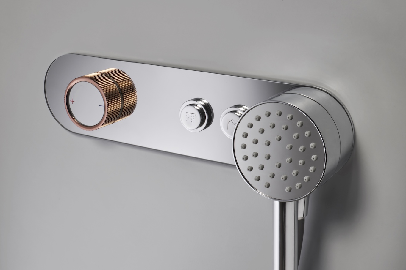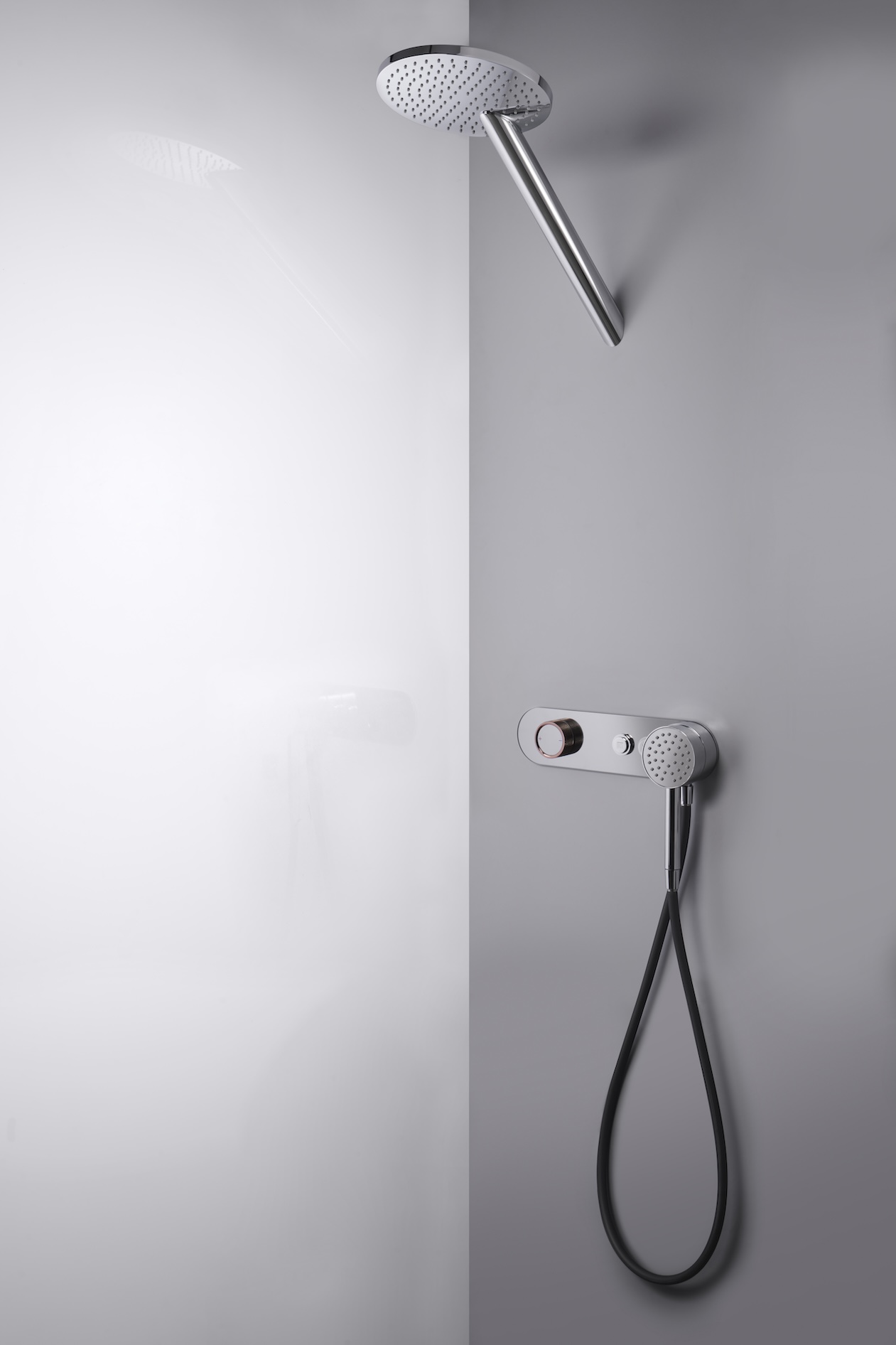 Il sistema doccia è uno dei punti di forza del progetto: il sistema doccia PUNTOEVIRGOLA vive in autonomia, posizionato a circa 185 cm da terra. Si tratta di un vero e proprio sistema completato da un corpo miscelatore ad incasso di 40 cm che accoglie comandi intuitivi, come il comando di erogazione, i pulsanti selettori per la scelta tra doccetta e soffione e la doccetta monogetto dotata di supporto magnetico e un flessibile antitorsione con la possibilità di tre colorazioni (cromato, antracite e bordeaux).