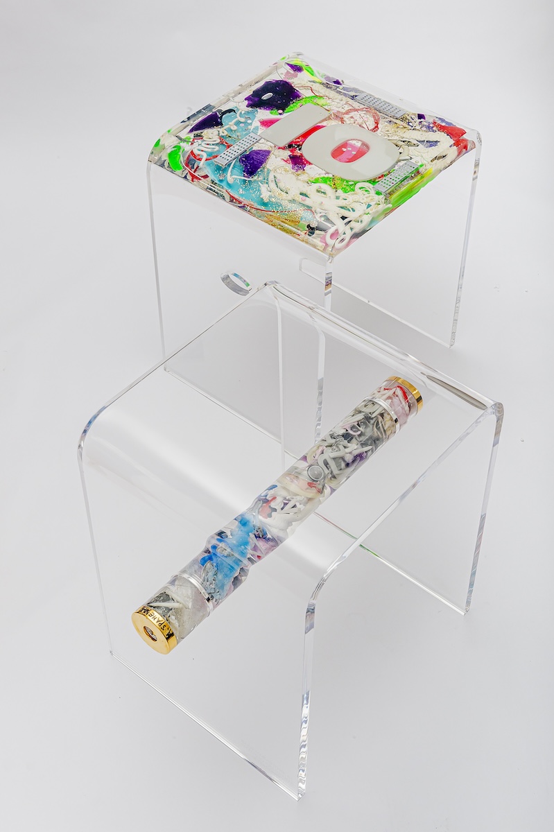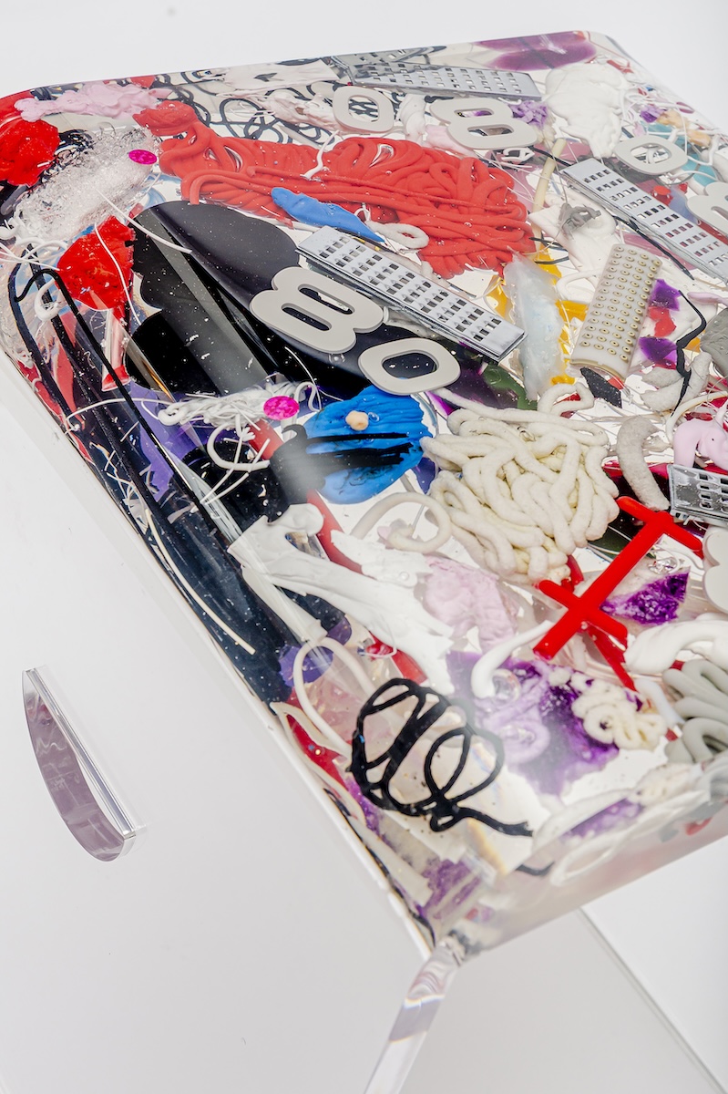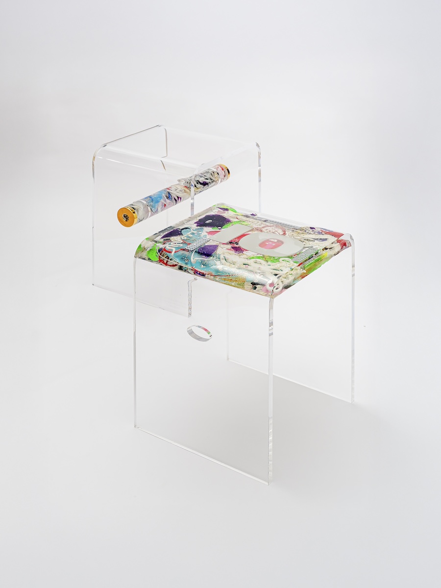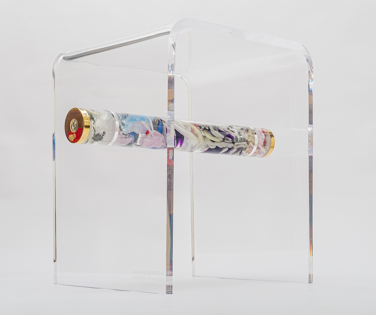 Le opere della collezione sono sedute realizzate in plexiglass e arricchite con materiali provenienti dalle lavorazioni Damast e Vifra – azienda del gruppo specializzata in stampaggio materie plastiche – e sono un esempio concreto di come lo scarto industriale possa essere rigenerato in valore estetico, narrativo e simbolico. Il recupero non è inteso come semplice riciclo funzionale e concreto, ma come possibilità creativa e simbolica. Le sedute sono strutture trasparenti dotate di un cuscino in resina che ingloba frammenti industriali e dettagli decorativi, con riferimenti stilistici alla precedente serie Message in a Bottle dell’artista. Ogni opera è ideata con soggetti visivi originali – paesaggi, visioni astratte, mondi immaginari – nati dall’interpretazione della realtà di Spanedda.