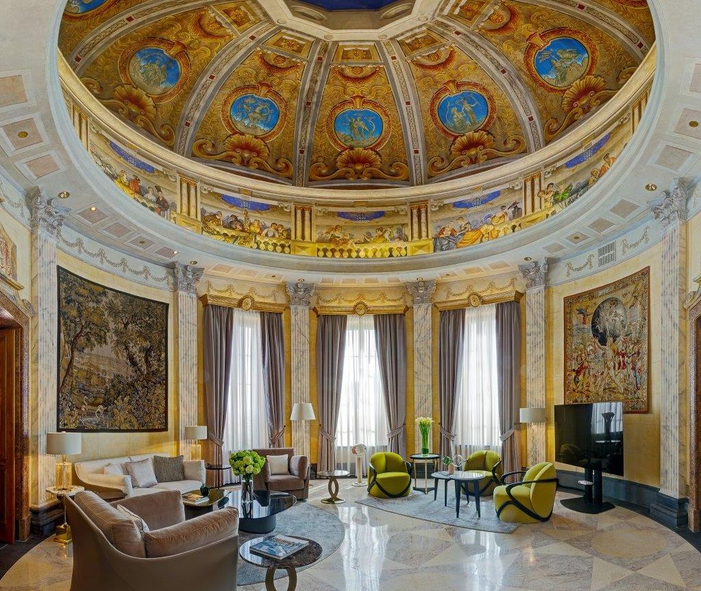 Il soggiorno di Villa La Cupola con la cupola affrescataL’iconica suite del The Westin Excelsior Rome Villa La Cupola è stata sottoposta a un importante intervento di restyling che la rende ancora più esclusiva. Con la sua estensione di 1100 metri quadri la suite dello storico hotel affacciato su via Veneto è tra le più grandi d’Europa e tra le più lussuose al mondo.